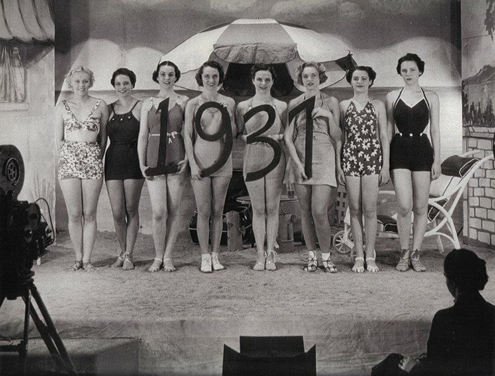 Отдельно стоит отметить такой предмет одежды как купальник. Силуэт купальника 1930-х годов был вдохновлен мужскими купальниками, которые все еще оставались цельными, напоминая цирковое трико, но сами купальные костюмы годов стали более открытыми по сравнению со стилями 1920-х годов. Тонкие бретельки также стали изобретением той эпохи — отныне женщины могли щеголять плечами, которым следовало быть крепкими и мускулистыми. |